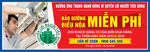 Bên cạnh đó, ngoài chương trình bảo dưỡng điều hòa miễn phí, Trần Anh còn thực hiện chương trình khuyến mại từ ngày 20/3 đến 25/3/2015 với rất nhiều các sản phẩm giảm giá vô cùng hấp dẫn.