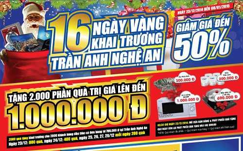 Từ ngày 12/12 tại số 01 Nguyễn Lương Bằng – thành phố Hải Dương và ngày 19/12 tại số 343 Lê Duẩn – thành phố Vinh; số 279 Trần Nguyên Hãn – thành phố Hải Phòng, siêu thị Điện máy Trần Anh chính thức bán hàng mở cửa với chương trình khuyến mại nhân dịp mừng khai trương siêu thị mới giảm giá hàng loạt sản phẩm lên đến 50%. Đặc biệt, Trần Anh gửi tặng hàng nghìn phần quà trị giá đến 1,000,000đ cho những khách hàng đầu tiên có đơn hàng từ 799,000đ tại 03 siêu thị mới.