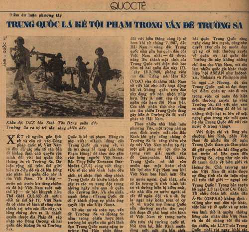 Vẫn trong bài báo của Thanh niên: “Từ Pháp - nước mà trước kia từng chiếm và đô hộ Việt Nam suốt một thế kỷ - tờ báo khuynh hữu Thế giới (3.3.88) đã viết: "Kể từ thế kỷ 17, Việt Nam đã có chân về kinh tế cũng như chính trị trên các đảo này, và bằng chứng đưa ra là chính quyền thuộc địa Pháp đã sáp nhập vào Đông Dương cả hai quần đảo Hoàng Sa và Trường Sa".