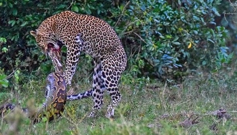 Không lâu sau, cuộc chiến hiếm gặp giữa hai loài săn mồi hàng đầu nổ ra. Báo hoa mai dường như sắp thua cuộc. Trăn đá bắt đầu quấn quanh đối thủ để làm báo ngạt thở. Tuy nhiên, với phản ứng nhanh nhạy, báo hoa mai trốn thoát kịp thời và nhảy xa khỏi tầm với của trăn. Nó lao tới cắn và cào khắp mình trăn đá.