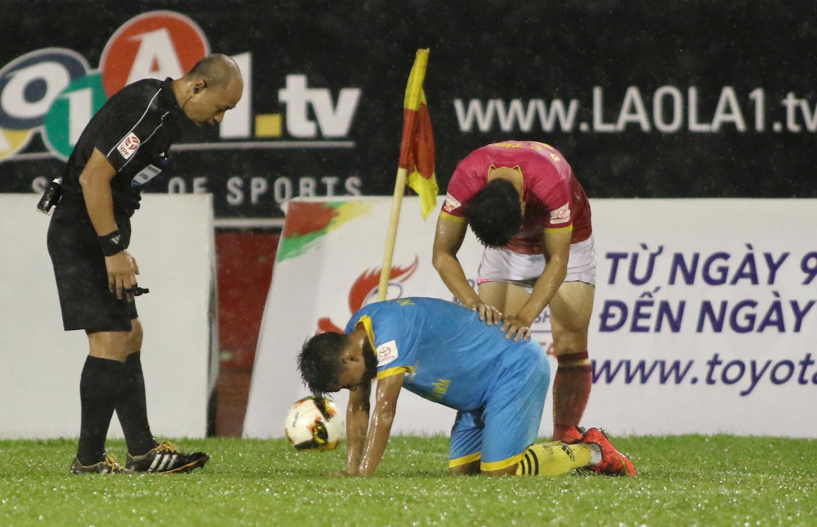 Bởi, không phải lúc nào khán giả cũng có thể thấy cảnh, đang phút cuối và đội đang cần điểm, Đỗ Văn Thuận lại bỏ dở quả phạt góc để ra... đấm lưng cho Hoàng Nhật Nam. Ngộ nghĩnh hơn là Thuận chọn cách đấm bằng lòng bàn tay, vốn sẽ gây cảm giác đau ở ngoài da khi đang mặc áo ướt nước mưa (Ảnh: Hoàng Tùng)