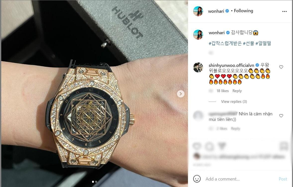 Mới đây Hari Won khoe sở hữu chiếc đồng hồ Hublot Big Bang Sang Bleu Gold Pavé, dù không tag người tặng nhưng ai cũng biết Trấn Thành là người đứng sau món quà này. Thiết kế có tông đen và vàng gold chủ đạo, mặt nạm kim cương.