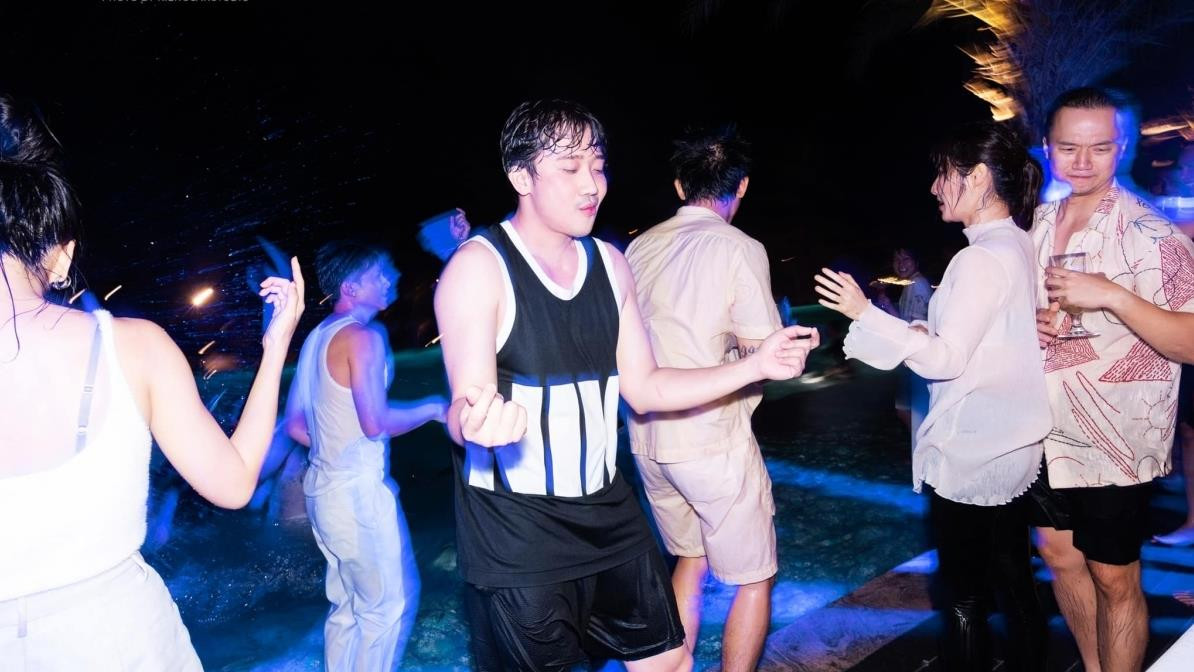 Vừa đăng loạt ảnh ‘’nóng’’ tại hồ bơi, Trấn Thành liền bị bà xã Hari Won nhắc nhở. Cụ thể trong đoạn tin nhắn do nam danh hài đăng tải, bà xã anh đã tỏ ra thắc mắc khi anh không đủ sức bế vợ, thế mà lại đủ sức bế nhiều người đẹp đêm qua có mặt tại đám cưới ném xuống hồ trong cuộc vui. Đáp lại lời phàn nàn của vợ, Trấn Thành dí dỏm: “Có khiêng vợ mà. Hồi xưa yếu, giờ mạnh rồi”.