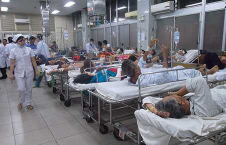 Đã 4 giờ sáng, bệnh nhân từ khắp các tỉnh như Bến Tre, Tiền Giang, An Giang và TP.HCM liên tục được đưa đến. Căn phòng gần 200 m2 gần như chật kín. Các băng ca được đẩy sát đến trước cửa phòng mổ. Nhiều bệnh nhân phải nằm chung, hai người một giường. Lại một đêm trắng của các y, bác sĩ nơi đây.