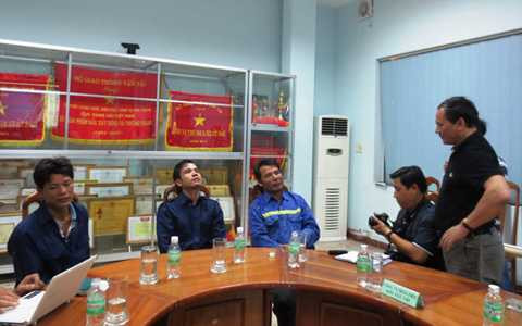 | Cục trưởng Cục Hàng hải Nguyễn Nhật (người đứng áo đen) động viên 3 thủy thủ |