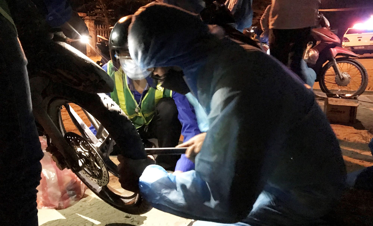 2h ngày 28/7, P.V VTC News có mặt tại chốt kiểm soát dịch trên Quốc lộ 14B thuộc địa phận xã Hòa Khương, huyện Hòa Vang, Đà Nẵng. Tại đây, gần 20 thanh niên tình nguyện của Trường Đại học Đông Á, thợ sửa xe trong trang phục bảo hộ với đầy đủ dụng cụ sửa chữa xe máy, nước uống đang túc trực, sẵn sàng hỗ trợ những trường hợp cần giúp đỡ.
