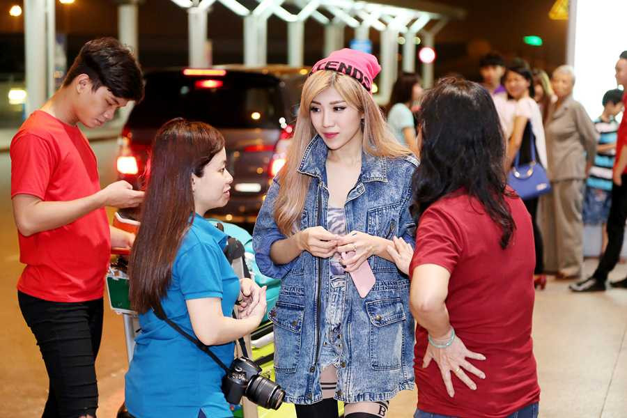Trong chuyến đi của Trang Pháp năm nay còn có sự tham gia của ca sỹ Uyên Linh. Xuất hiện tại sân bay với trang phục thể thao năng động và cá tính, Trang Pháp thu hút nhiều sự chú ý. Cô nhanh chóng làm thủ tục để kịp chuyến bay.