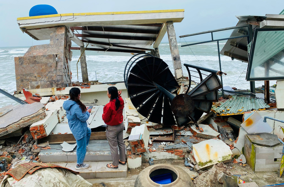 Dãy nhà của anh em chị Hường tiếp tục bị sóng dữ công phá, kéo tuột xuống biển.