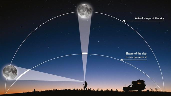 Ảnh đồ họa mô tả hiện tượng "ảo ảnh Mặt Trăng", khi lớp khí quyển đóng vai trò như thấu kính lẫn lăng kính, khiến Mặt Trăng càng ở dưới thấp (mới mọc hoặc sắp lặn) sẽ to hơn và đỏ hơn. (Ảnh: BBC SKY AND NIGHT MAGAZINE)