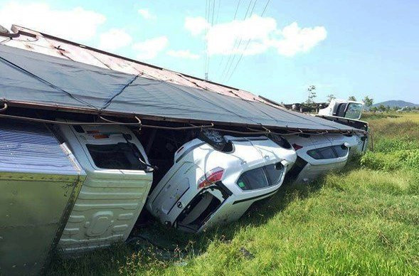 Sau cú va chạm, chiếc xe tải chở nhiều xe con trên thùng bị văng xuống ruộng.