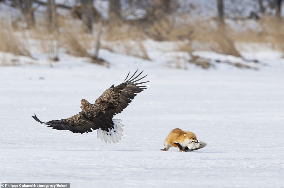 Một con đại bàng khác kiên trì bám theo con cáo đỏ dọc theo hồ nước đóng băng gần Hokkaido, Nhật Bản.