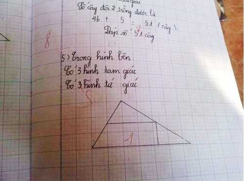 Đề bài đưa ra một hình tam giác, bên trong hình tam giác có vẽ thêm một đường song song với cạnh đáy và một đường kẻ vuông góc với cạnh đáy. Phần lời được trình bày bên cạnh hình vẽ như sau: “Trong hình có 3 hình tam giác, 3 hình tứ giác”. Tuy nhiên, câu trả lời trong hình bên có 3 hình tứ giác bị chấm là sai, thay vào đó là đáp án chỉ có 1 hình tứ giác.