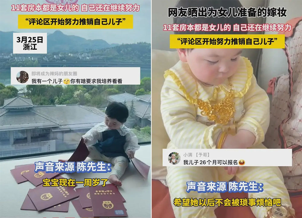 Mấy ngày nay, cư dân mạng Trung Quốc bàn tán sôi nổi khi một người đàn ông ở Chiết Giang khoe trên trang cá nhân việc vợ chồng anh để dành cho con gái mới 1 tuổi tới 11 căn hộ để làm của hồi môn.