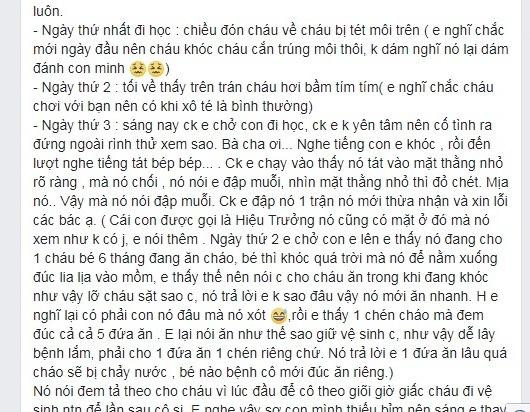 Tuy nhiên, đến sáng ngày 13/9, chồng chị L. chở con đi học nhưng không yên tâm nên cố tình ra ngoài đứng rình thì nghe thấy tiếng con khóc ré lên và tiếng tát. Chạy vào, anh thấy cô giáo đang tát con mình bép bép. Cô giáo giải thích là đang đập muỗi nhưng nhìn má con trai đỏ ửng, bố đứa trẻ không thể kiềm chế đã lao vào đánh cô giáo. Sau đó, cô giáo đã thừa nhận sự việc và xin lỗi phụ huynh.