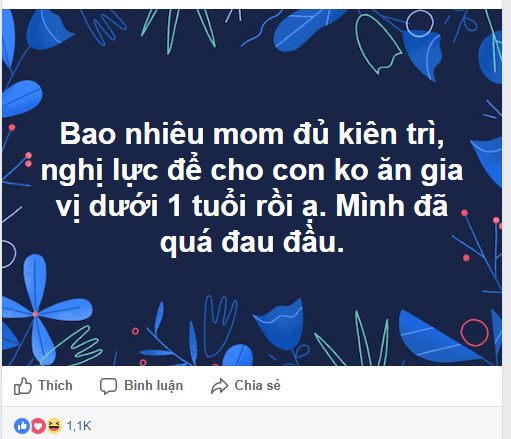 Có lẽ vì thế mà chỉ cần “ai đó” có một chút “động chạm” tới “dây thần kinh nhạy cảm” này là y như các mẹ lại có dịp tranh nhau bày tỏ quan điểm. Mới đây, đề tài muôn thuở này lại được đem ra mổ xẻ khi một mẹ bỉm sữa than thở: "Bao nhiêu mom đủ kiên trì, nghị lực để không cho con ăn gia vị dưới 1 tuổi rồi ạ? Em đang quá đau đầu". Ngay lập tức, topic này nhận được “ngàn like” của các mẹ cùng hàng trăm bình luận sôi nổi.