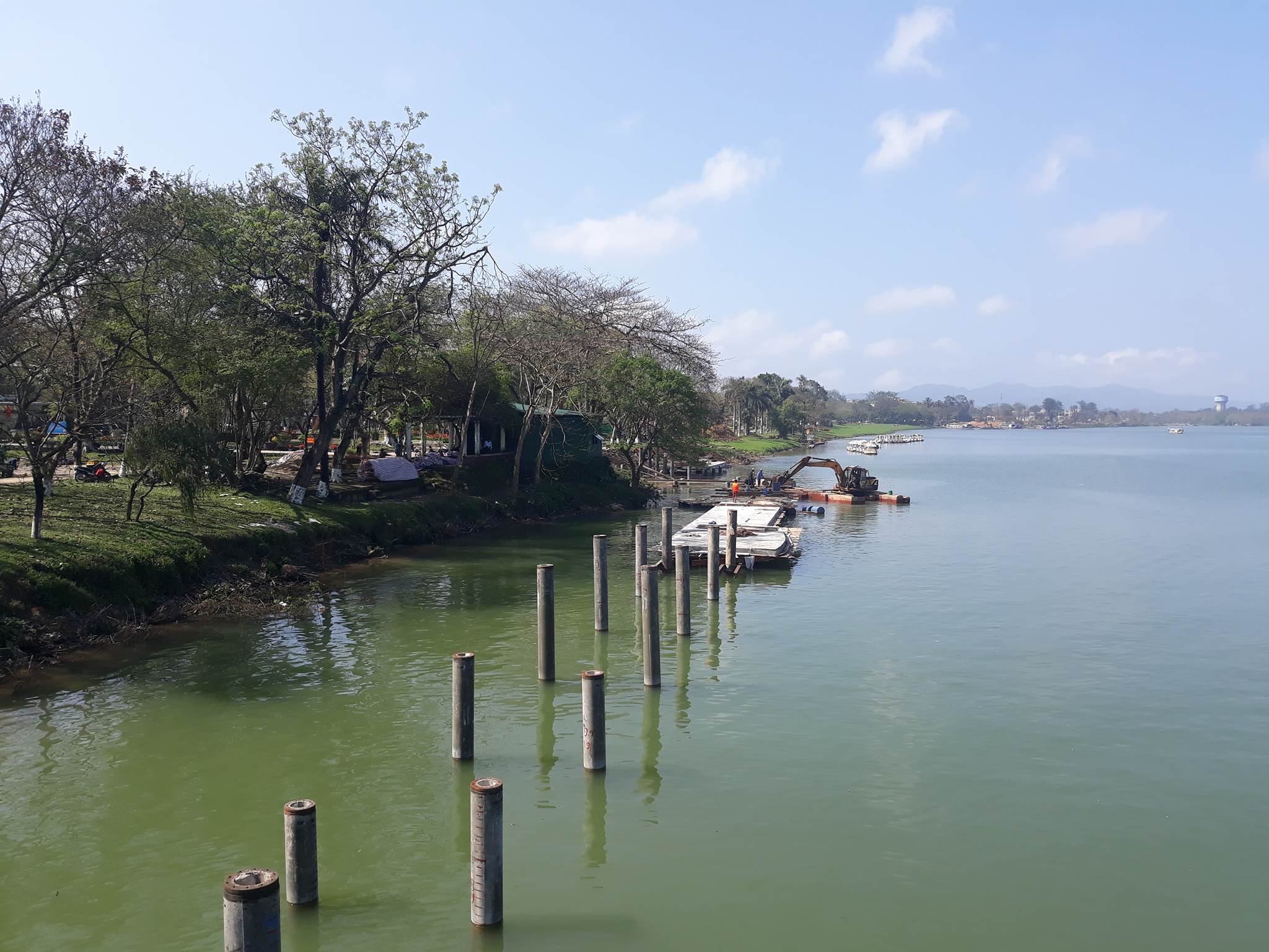 Dự án đang được đơn vị thi công triển khai đóng cọc xuống sông Hương. (Ảnh: Điền Quang)