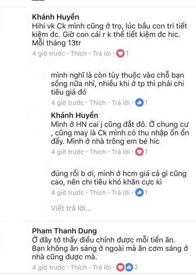 Facebook L.T.H: “Ợ. Em cũng có bầu xong ở nhà ăn bám. Cơ mà như tháng vừa rồi tất tần tật cũng tiêu hết 4tr5 thôi ạ. Tiền nhà + điện + nước 1,3 triệu thôi. Sữa bầu 2 hộp 1 tháng là 350.000. Chủ yếu dùng mạng nên điện thoại 1 tháng 2 vợ chồng dùng hết 100.000. Sáng ăn ở nhà đơn giản nên không tính. Thi thoảng 1 tháng về quê thì bố mẹ cho gạo với rau quả, trứng, lạc... Ăn dần đỡ được chút. Tháng vừa rồi thêm mấy cái quần áo cũng có 500.000".