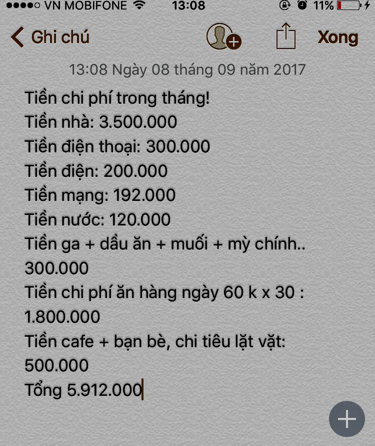 Facebook M.H chia sẻ: “Bạn không nên ăn sáng ngoài. Tự nấu sẽ tiết kiệm hơn. Chi 3G chỉ 50.000/tháng, đã dùng Internet rồi thì cắt 3G. Nên tiết kiệm khoản điện nước lại hơn nữa. Thuê nhà nếu có thể thì giảm xuống 1 chút là tiết kiệm được ngay”.