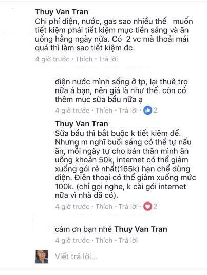 Facebook Thúy Vân Trần: “Chi phí điện, nước, gas sao nhiều thế. Buổi sáng có thể tự nấu ăn, mỗi ngày tự cho bản thân mình ăn uống khoảng 50k, internet có thể giảm xuống gói rẻ nhất 165.000 đồng, hạn chế dùng điện. Điện thoại có thể giảm xuống mức 100.000 đồng, chỉ cần nghe gọi, không cài gói 3G nữa vì nhà có mạng”.