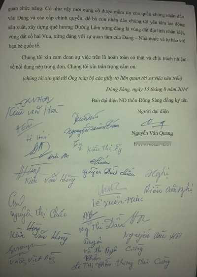 | Lá đơn với chữ ký của nhiều người dân thôn Đông Sàng gửi UBND TP.Hà Nội. |