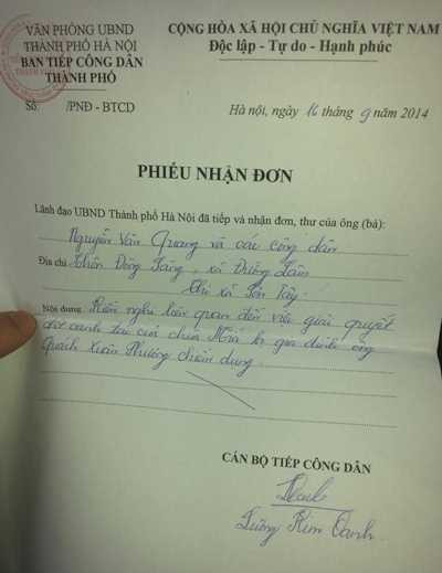 | Phiếu nhận đơn của Văn Phòng UBND TP.Hà Nội. |