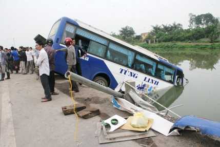 (VTC News)- Khoảng 7h30 sáng nay 3/4, chiếc xe khách đi từ Hải Phòng đã bất ngờ cán đổ cột điện bên đường lao xuống sông bên kia đường sau khi tránh một cụ già qua đường.