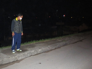 Nạn nhân Ba (bị đâm thủng má) chỉ đoạn đê nơi sự việc xảy ra.