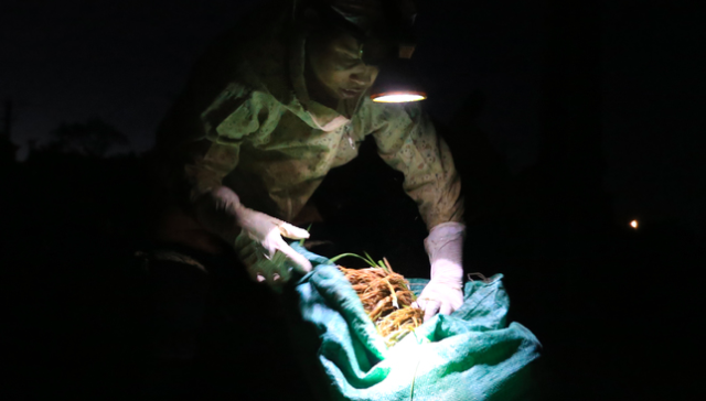 Chị Trần Thanh Huyền dùng đèn pin soi sáng mạ để xếp vào bao tải mang đi cấy.