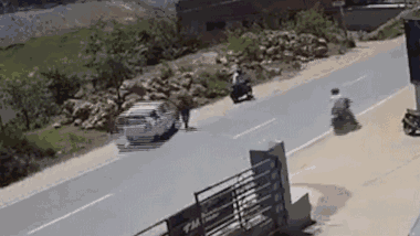 Tài xế ô tô tránh người đàn ông qua đường đã tông vào đống đất và lật nhào tại Himachal Pradesh, Ấn Độ.