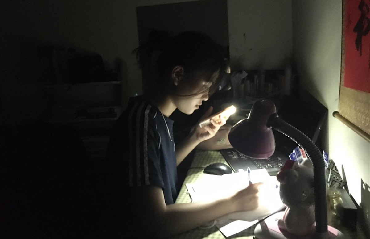 Nữ sinh vừa ôn thi vừa cầm đèn pin điện thoại soi để có ánh sáng học bài.