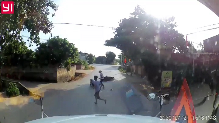 Tránh trẻ chạy sang đường, 2 người đi xe máy ngã dúi dụi trước container