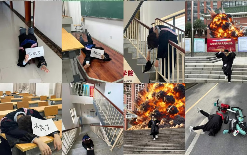Giới sinh viên đại học tại Trung Quốc đang đua nhau chụp ảnh kỷ yếu tốt nghiệp bằng cách tham khảo các meme trên internet để thể hiện thái độ sống phóng khoáng của mình. Hashtag “đừng quá nghiêm túc trong ảnh tốt nghiệp” đã trở thành xu hướng trực tuyến khi thời điểm tốt nghiệp đang đến gần, thu hút 8 triệu lượt xem trên một nền tảng truyền thông xã hội.