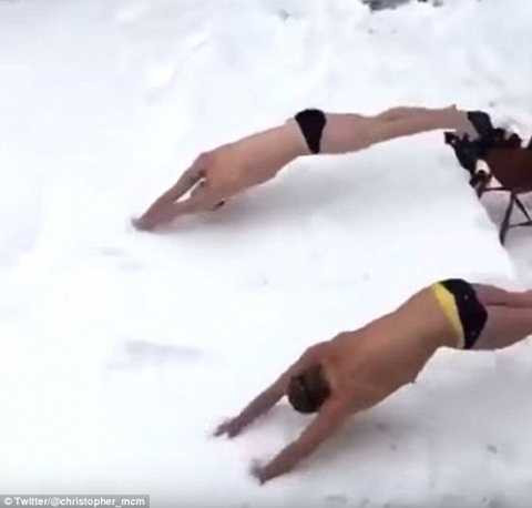 Hai anh chàng của đội bơi lội trường đại học West Virginia còn sáng tạo hơn khi thực hiện động tác khởi động trên ghế sau đó bơi như đang ở dưới nước nhưng rất tiếc không thành công bởi tuyết khá dày.