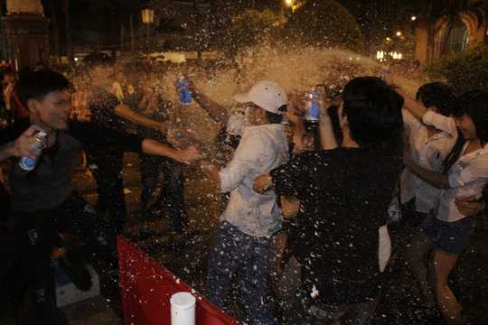 | Hai cô gái phải cúi người, ôm mặt khi bị xịt tuyết vào mặt. Chị Lan Anh (sinh viên trường ĐH KHXH&NV) bức xúc: "Mình đã la toáng lên phản đối mà nhiều người cứ xịt tuyết vào người, bay cả vào mắt mình". |