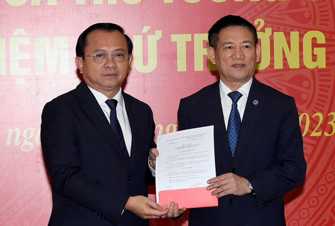 Ông Lê Tấn Cận (trái) nhận Quyết định của Thủ tướng Chính phủ điều động, bổ nhiệm Thứ trưởng Bộ Tài chính.