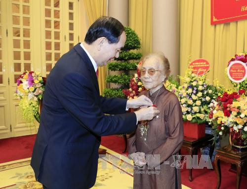 Thay mặt Lãnh đạo Đảng, Nhà nước, Chủ tịch nước Trần Đại Quang đã trân trọng trao bằng, Huy hiệu 70 năm tuổi Đảng tặng nguyên Phó Chủ tịch nước Nguyễn Thị Bình.