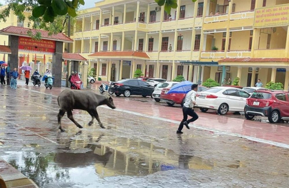 Trâu lao vào điểm thi tại trường THPT Kiến Thuỵ, Hải Phòng. (Ảnh: Facebook)