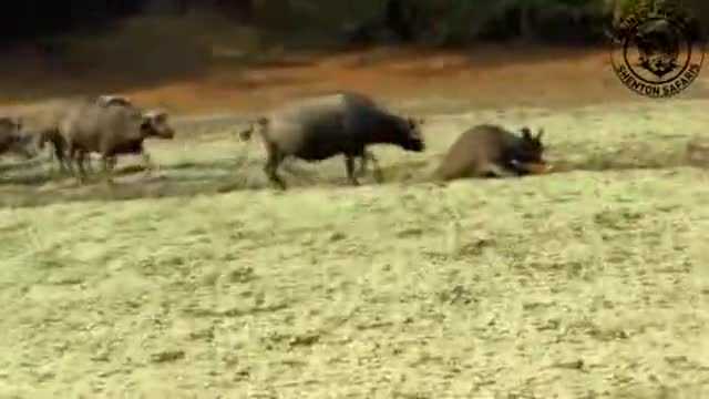 Trâu rừng điên cuồng húc văng sư tử, giải cứu đồng loại