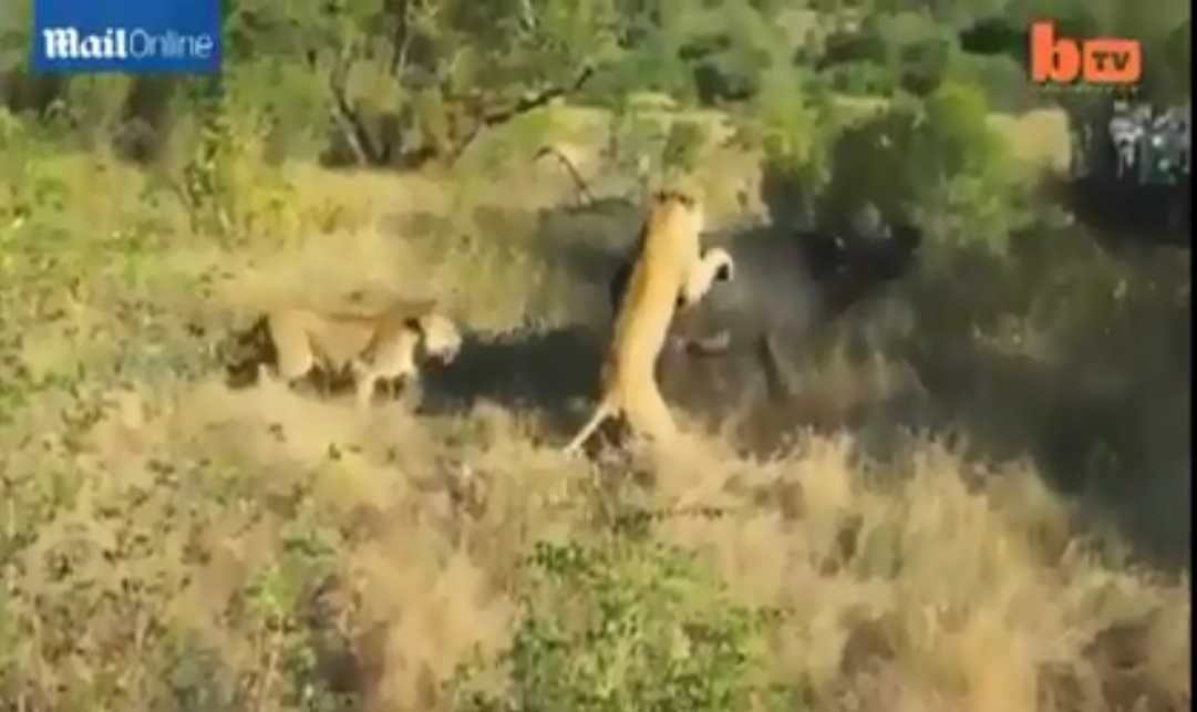 (VTC News)-Sau 6 giờ vật lộn dai dẳng, trâu rừng cuối cùng đã có thể bật dậy và tẩu thoát khỏi 2 con sư tử hung hãn.
