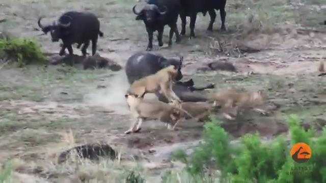 Trâu rừng hợp lực cứu đồng loại thoát bầy sư tử ngoạn mục
