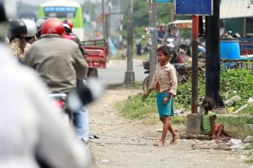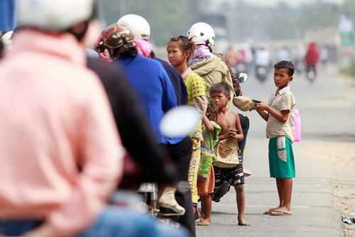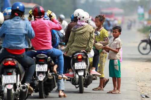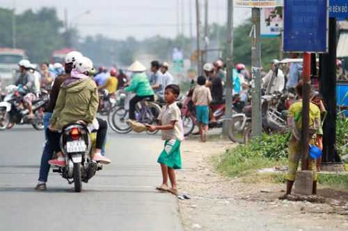 Hằng ngày, giữa cái nắng cháy da trên Quốc lộ 1A (đoạn qua khu vực Bến Lức, Long An), hàng chục trẻ em, đa phần là người Campuchia, phải chịu cảnh phơi nắng để xin tiền người đi đường tại các cột đèn giao thông.