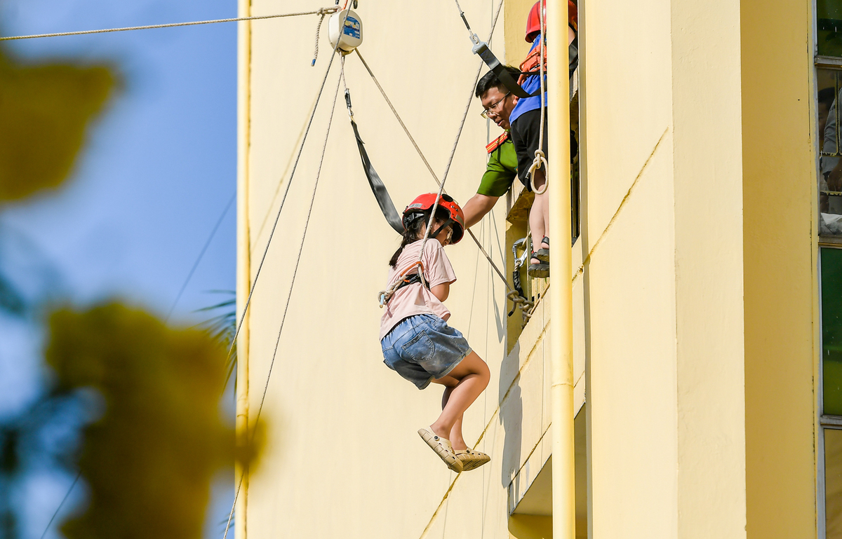 Các bạn nhỏ trải nghiệm thoát nạn trong môi trường giả định chật hẹp, có vật cản. Ngoài ra, các em còn được trải nghiệm thoát nạn từ tầng 3 bằng dây thả chậm và thực hành sử dụng chữa cháy bằng vòi xịt nước từ xa.