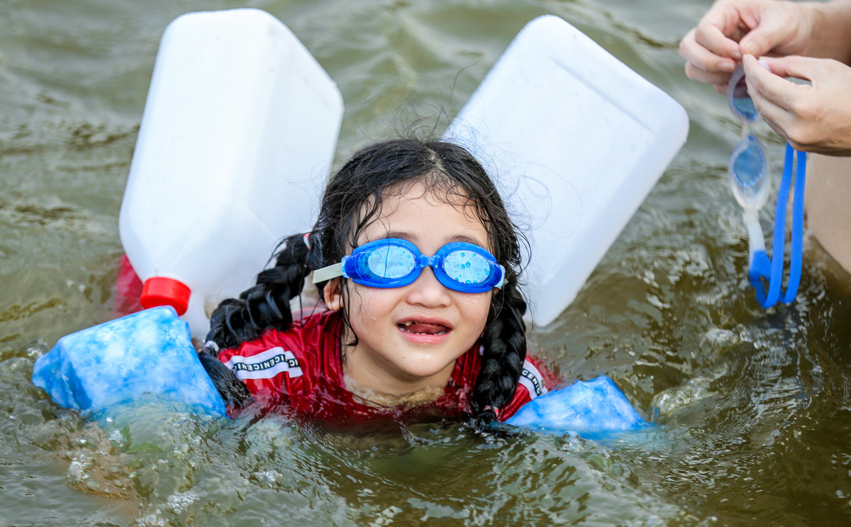 Chiều 21/5, rất đông người dân đưa con em mình ra hồ Long Trì để tắm giải nhiệt, phần lớn là các em thiếu nhi độ tuổi từ 5-15 tuổi. Trong đó, có nhiều em nhỏ chưa hề biết bơi và được các phụ huynh hướng dẫn tập bơi.