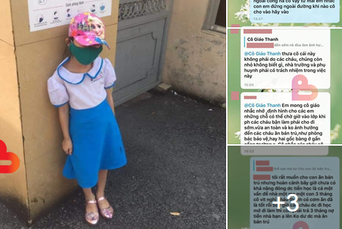 Đi được một lúc, thấy không yên tâm, chị quay lại thấy con đã bị đuổi ra ngoài cổng trường. Trước đó, con chị và một số bạn khác phải đứng lên bục giảng để cô chụp ảnh phê bình vì tội đi học sớm. Các con bị bạn bè cười chê. Cô giáo còn gửi ảnh lên nhóm chat riêng cho các phụ huynh cùng "ngắm".