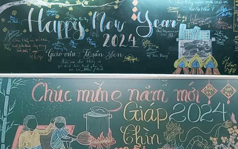 Còn 5 tuần nữa mới đến Tết Giáp Thìn 2024 nhưng hội học trò đã xôn xao, náo nức đến mức rủ nhau trang trí bảng lớp học với những hình ảnh đậm sắc xuân. Các hội nhóm trên mạng xã hội xuất hiện hàng loạt tranh Tết Giáp Thìn 2024 phiên bản lớp học.