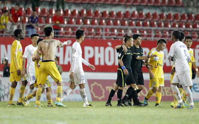 | Đinh Tiến Thành (cởi trần) đã có phản ứng thiếu văn hóa với tổ trọng tài (Ảnh: Thanh Niên) |