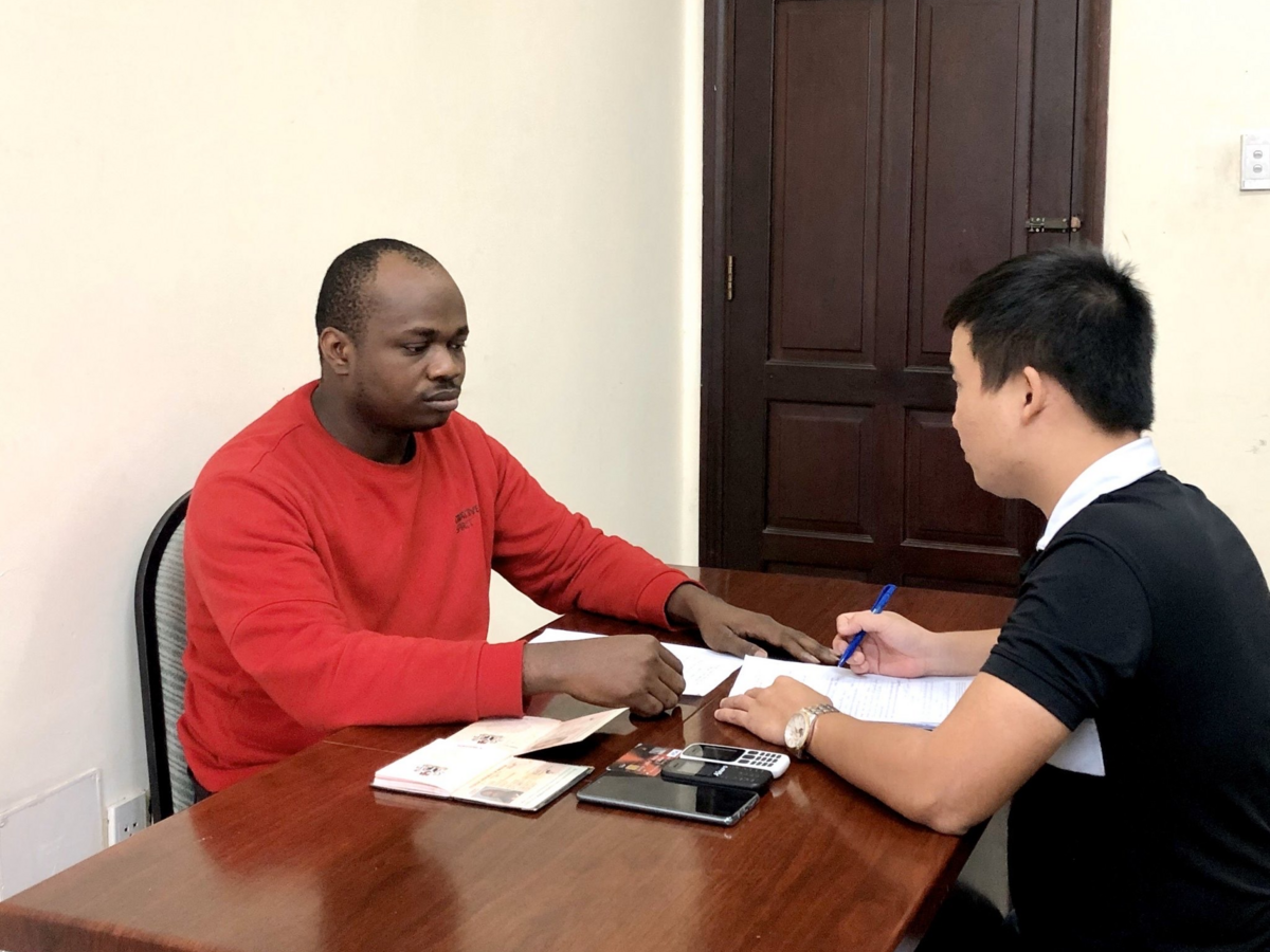 Chukwugekwe Godwin Ajearo (áo đỏ) - thành viên của nhóm người Nigeria lừa tiền online tại cơ quan điều tra. (Ảnh: Thượng Hiển)