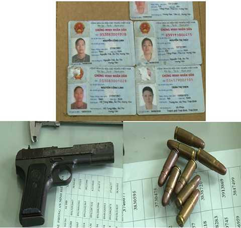 Khám xét nơi ở của hai đối tượng trên, lực lượng Công an phát hiện, thu giữ nhiều dụng cụ, tài liệu có liên quan đến việc làm giả chứng minh nhân dân, 1 súng K54, 10 viên đạn và 2 lưỡi lê.