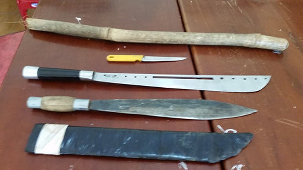 Khám xét khẩn cấp nơi ở của Lê Duy Long, lực lượng công an thu giữ 1 bình xịt hơi cay, 5 cây tuýp sắt, 3 mã tấu và nhiều giấy tờ liên quan đến hoạt động cho vay nặng lãi.