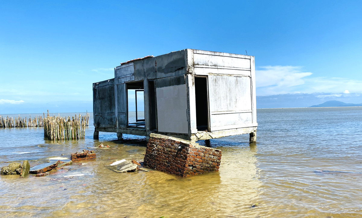 Riêng năm 2022, nước biển "ngoạm" sâu vào bờ thêm 50m khiến ngôi nhà vốn là điểm dừng chân của du khách này rệu rã, ngập giữa mênh mông nước.